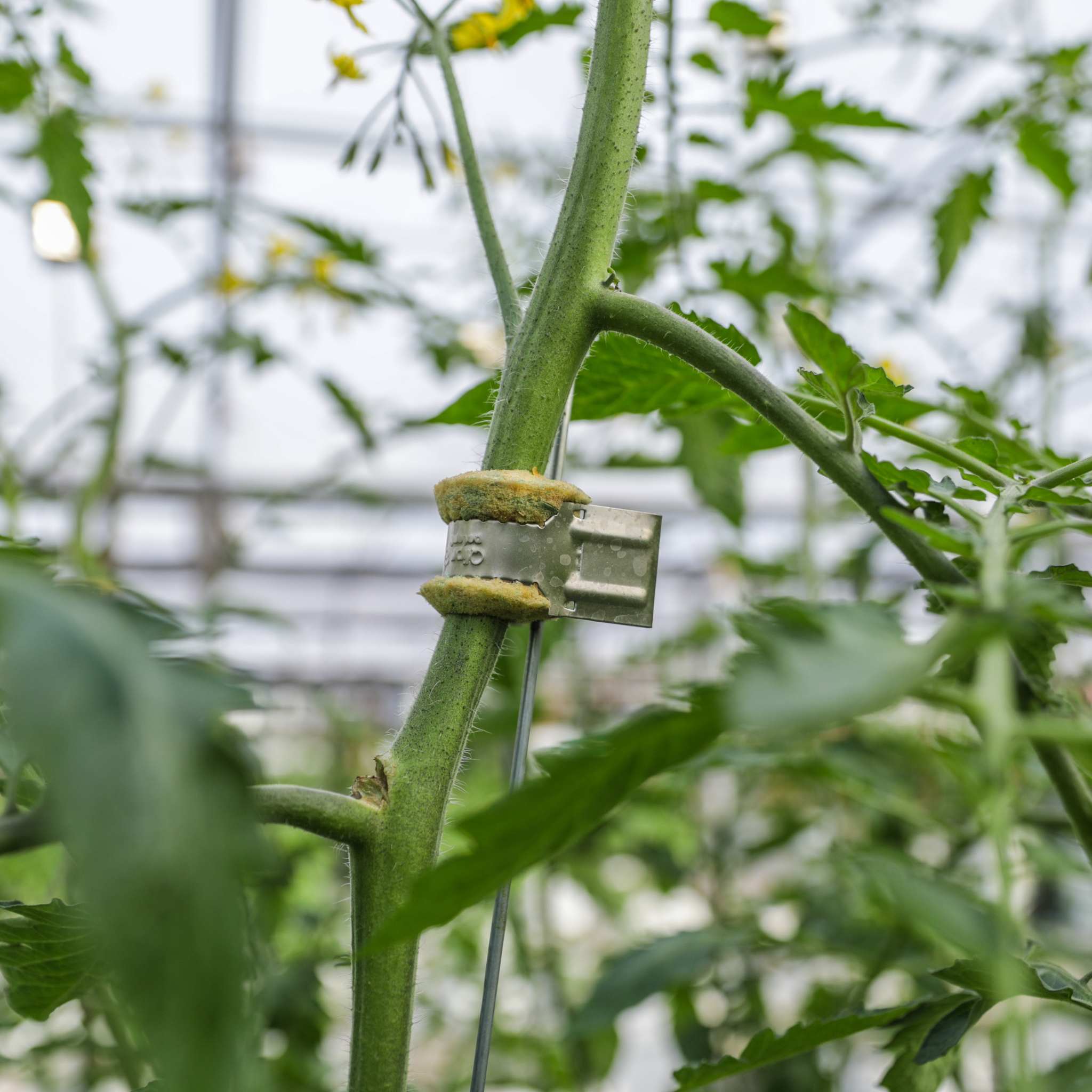 The system consists of a metallic plant hook and two foam-lined stainless steel clamps. This reusable, plant-friendly alternative reduces labor and waste and eliminates the need for traditional string trellising. The plant hook hangs on a stretched wire at the top of the greenhouse, providing strong and adjustable plant support.