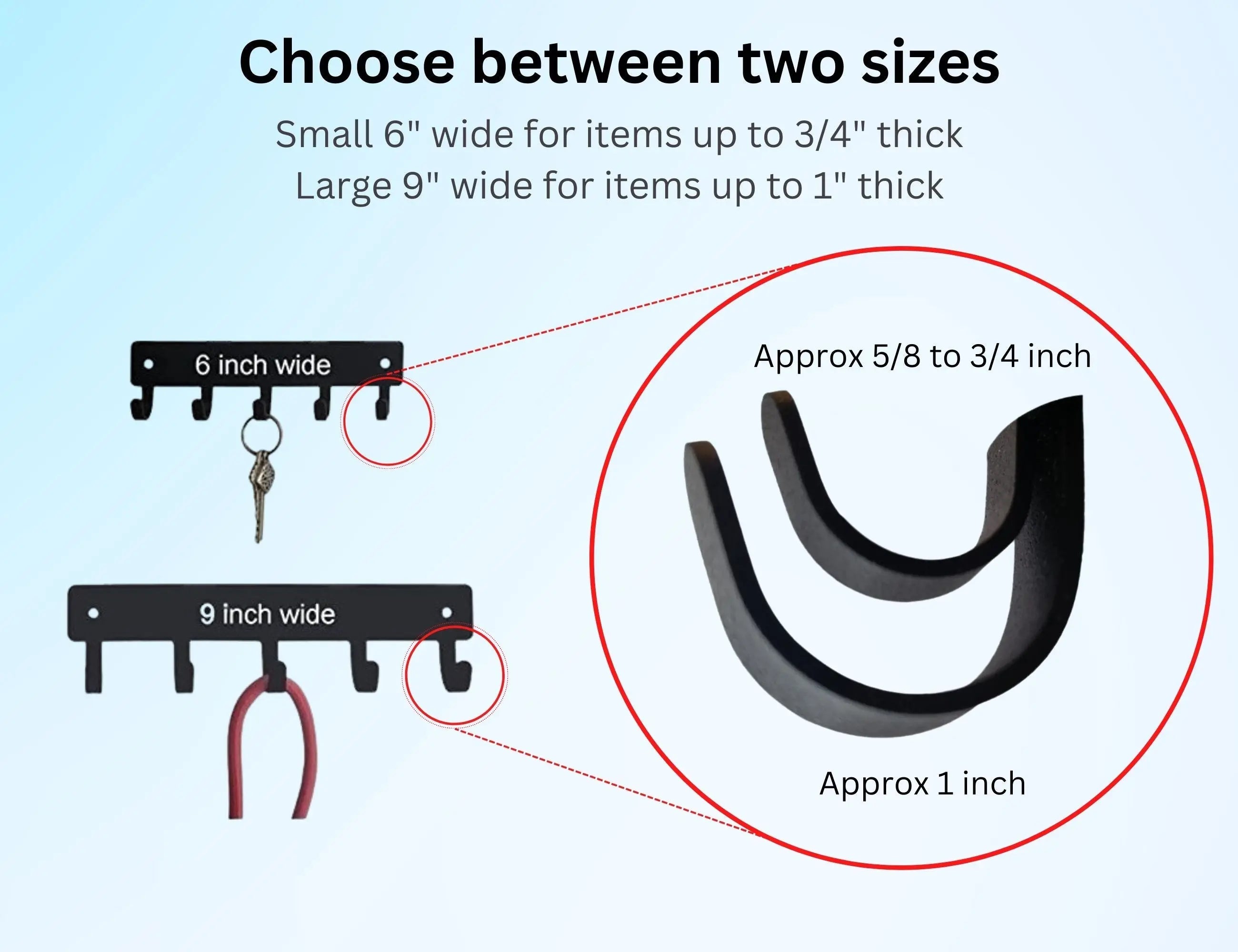 - 6 inches wide (with 5 hooks that are 5/8" deep).